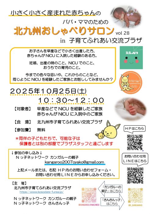 小さく生まれた赤ちゃんのための親子の会「Nっ子ネットワーク カンガルーの親子」が開催している「おしゃべりサロン」が“元気のもり”にやってきます。