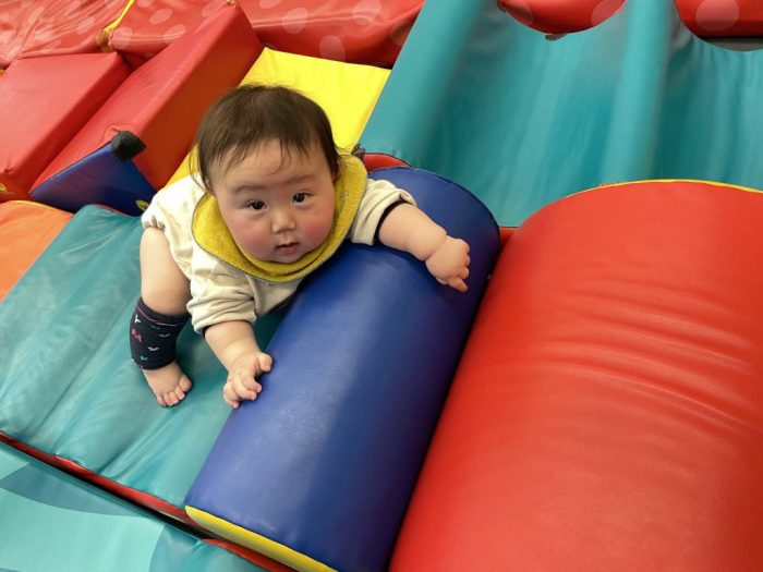 元気のもりでは、ハイハイ広場のでこぼこマットを使って、いつもとちょっと違うハイハイレースを行います!