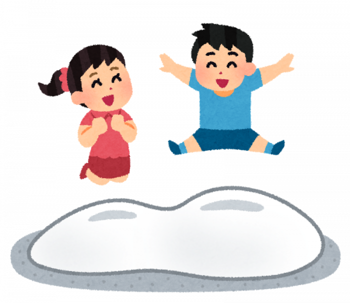 でこぼこの平均台や飛び石、トランポリン、跳び箱などなど。