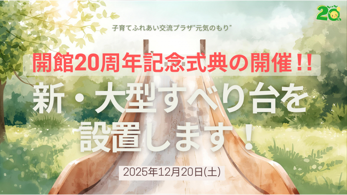 子育てふれあい交流プラザ“元気のもり”は、2025年12月23日に開館20周年を迎えます。